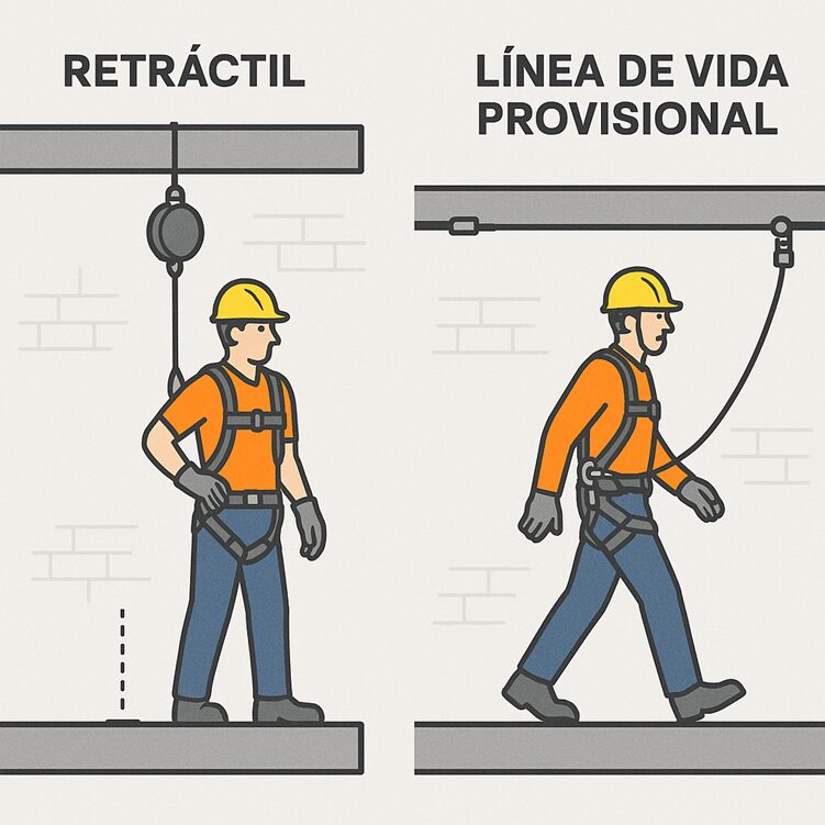 - El trabajador se engancha mediante un absorbedor de energía + eslinga o un retráctil con línea corta.
