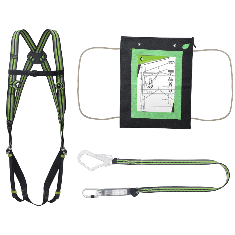 Kit para andamios con un arnés, una eslinga en cinta con absorbedor de energía